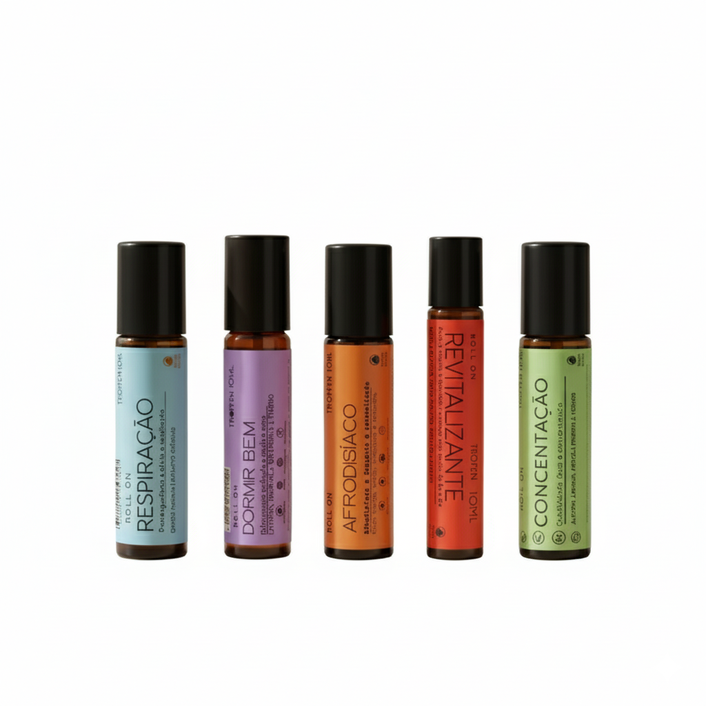 Blend de óleos essenciais roll-on REVITALIZANTE de Canela da China, Limão, Gerânio e Alecrim diluído em óleo vegetal de semente de uva.